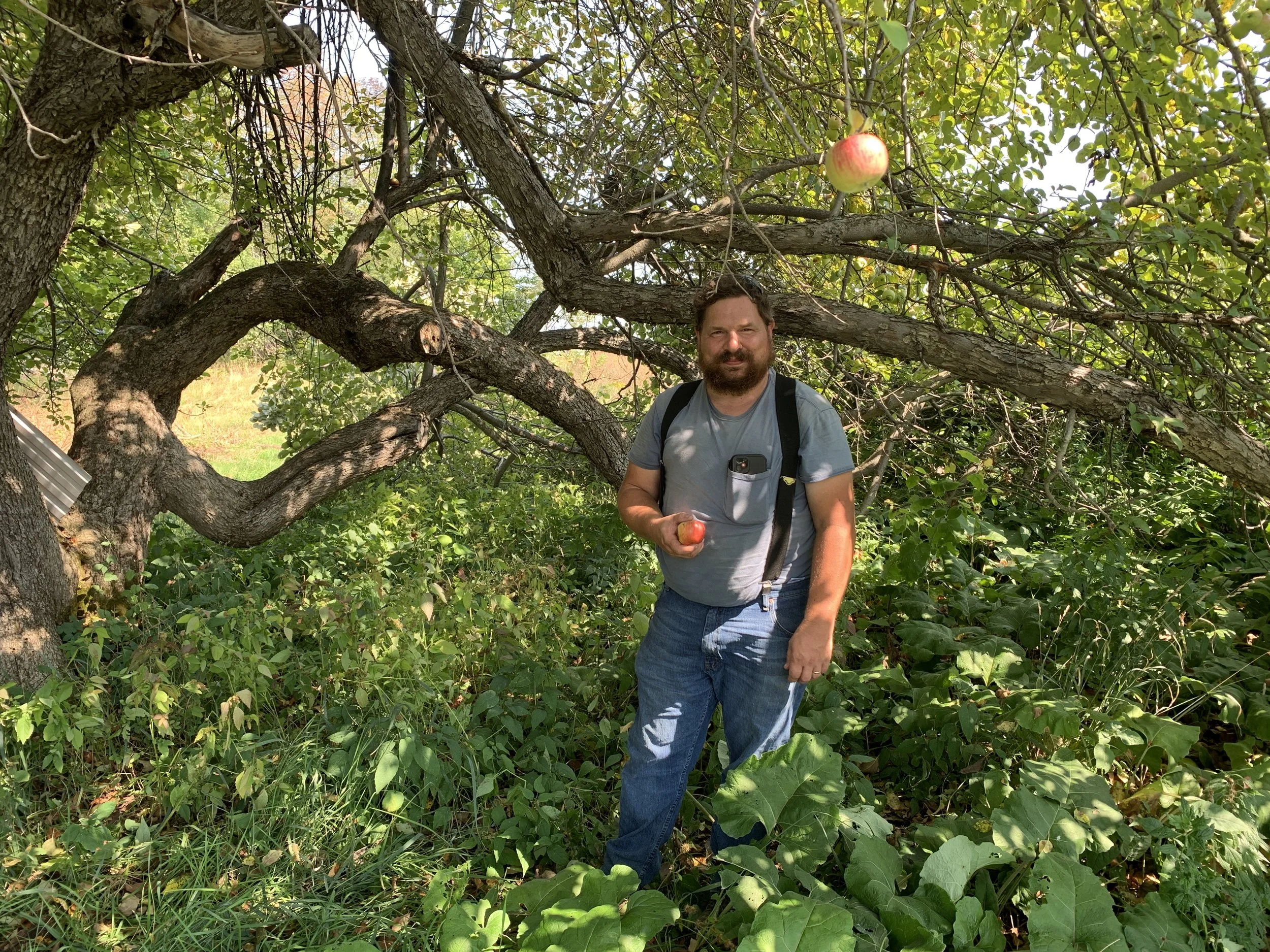 Ernest Rollins enjoying the shade under his massive Royal Sweet tree. The tree is surrounded by an armed regiment of burdock and motherwort sentries that keep all 2 and 4-legged marauders at bay. Even the apples on the heavily laden branches that bent to the ground were untouched. (The OOAL harvest crew that braved the burdock itched for several days.)