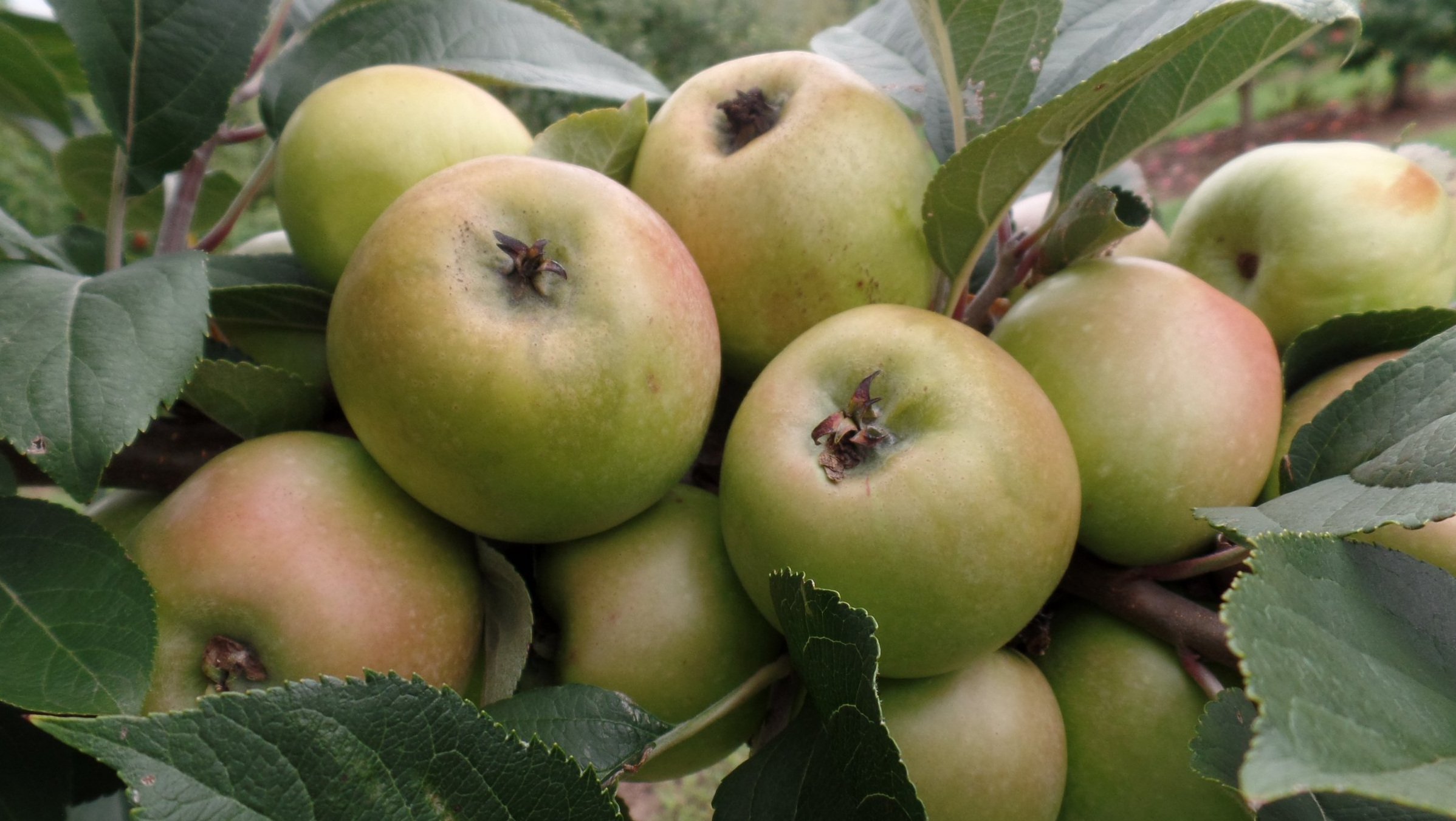 In your share bag you will find the old NH favorite - Nodhead, two Mac offspring - Spartan and Spencer, a NY giant - 20 Ounce, apple royalty - King of Tompkins County, and one unlabeled grab bag of mystery apples. You’re going to have to do a bit of sleuthing to figure out what’s what in the grab bag. The picture to the right will help you out. There should be 2-3 Ribston Pippin, 3-4 Burgundy, and 1 Hudson’s Golden Gem or 1 Tumanaga. The Ribston Pippin is heavily russeted around the cavity with vivid sunset red streaks and stripes running from the shoulder to the basin. Burgundy lives up to its name - a blotchy red over yellow that intensifies to a deep, opaque purple-rouge. If you are uncertain, cut the apple in half; Burgundy flesh is infused with pink. Hudson’s Golden Gem is an iconic conic - wider at the base than at the apex (think upside down ice cream cone). The yellow skin is dotted and streaked with russet. If you don’t find a Hudson’s Golden Gem in your bag then the remaining apple will be a Tumanga. Its shape is round and somewhat flat. It has a splash of russet around the stem, but not nearly as much as the Ribston. The yellow base color is obvious on most of the apples peeking through beneath a light red blush.