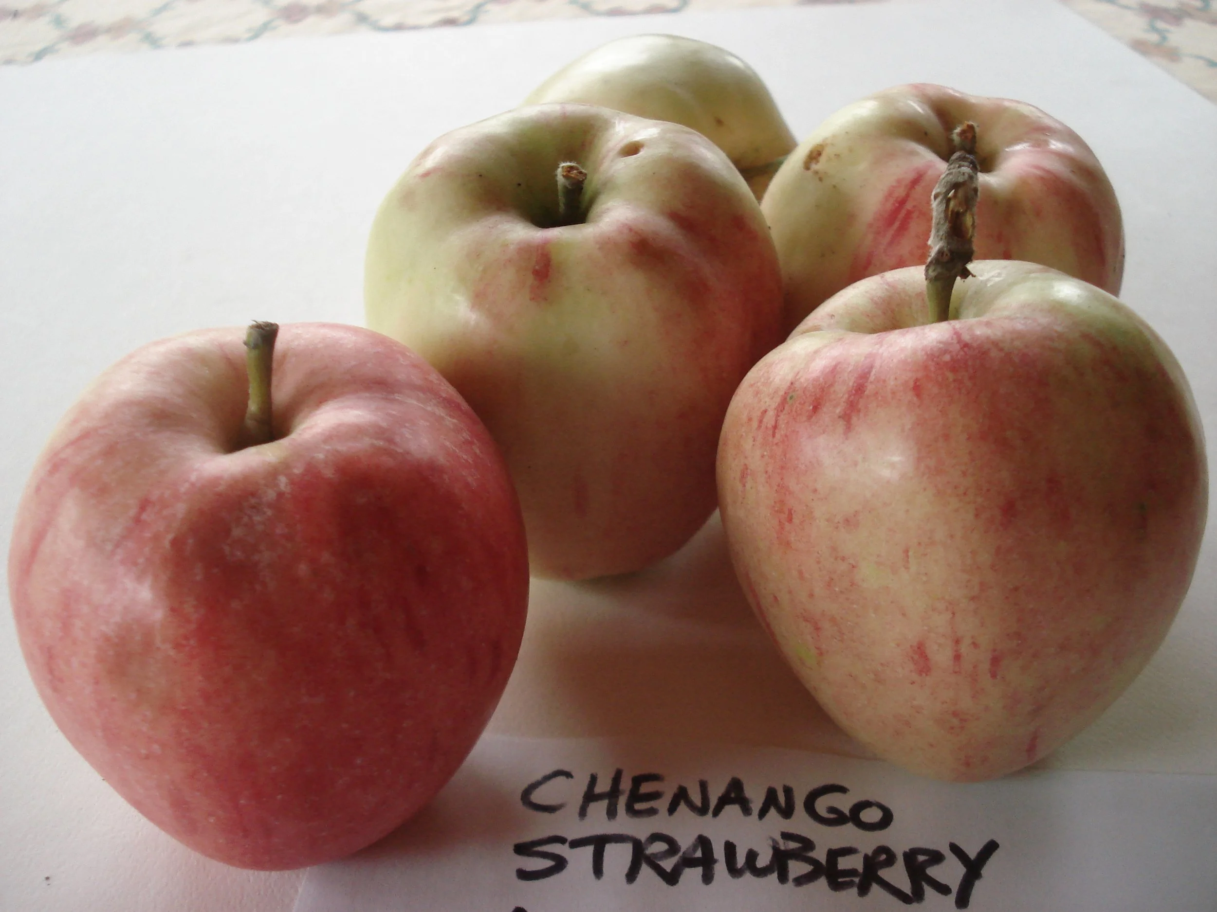 Although I could spend a few life times growing, eating and studying the apples here on the farm, there are many others of note that aren’t that far away. So today Skylar and I visited a few old summer-ripening apple trees in the area. One is in north Palermo and might be an old cultivar called American Summer Pearmain. The second, which is near the center of town, we know to be Chenango Strawberry.
