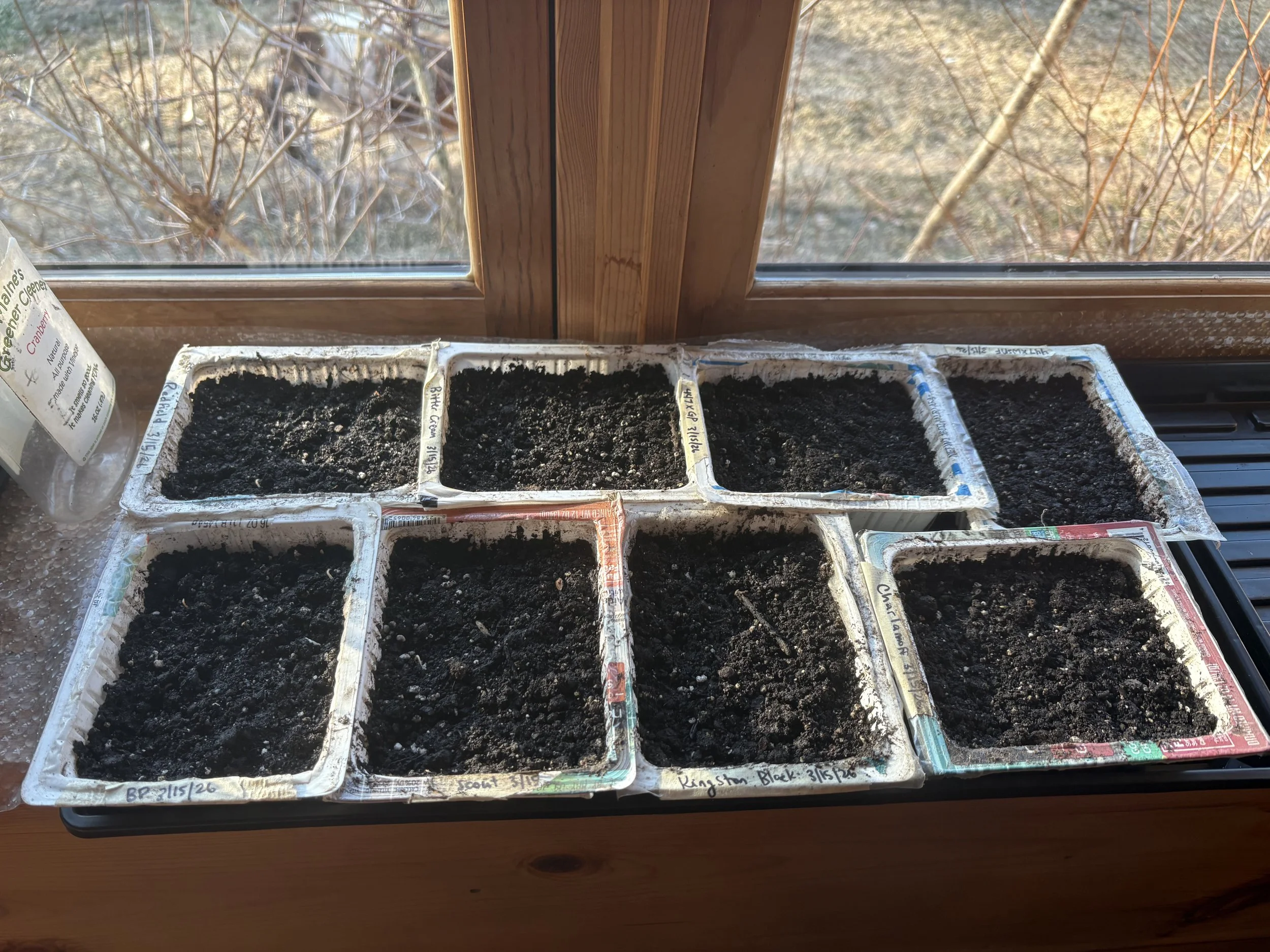 The apple seedlings are all on the window sill in their well-worn “tofu-tubs.” A few radicles are poking their tips up through the surface of the soil.