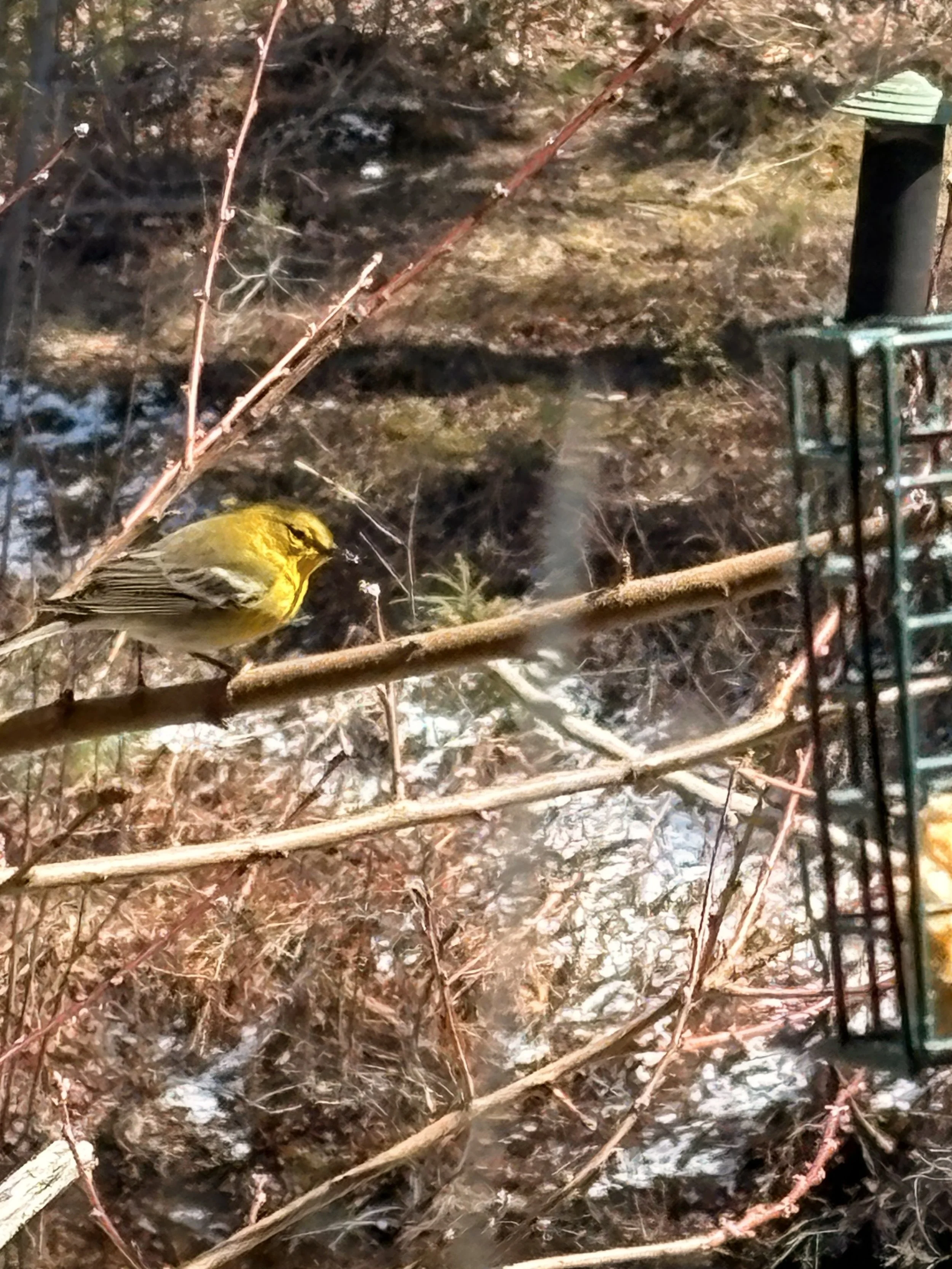 After much deliberation and consultation, we are fairly certain that we have a male Pine Warbler (Setophaga pinus) who has at least temporarily moved onto the farm and who spends the majority of his time at the suet feeder. Being only 18” from the kitchen window, we’ve had a lot of time to stare at bird and book. Why are the warblers so hard to tell apart? It’s hard enough telling a Duchess of Oldenburg from a Nutting Bumpus. Or a Deane from a Milwaukee. Or a Brigg’s Auburn from a Northwestern Greening. Argh! Clearly when they made the warblers, it was all about humiliating ornithologists. No question. The warblers make the apples look easy. At least the apples sit still on the table as I stare at them… or cut them up and look at their internal organs.