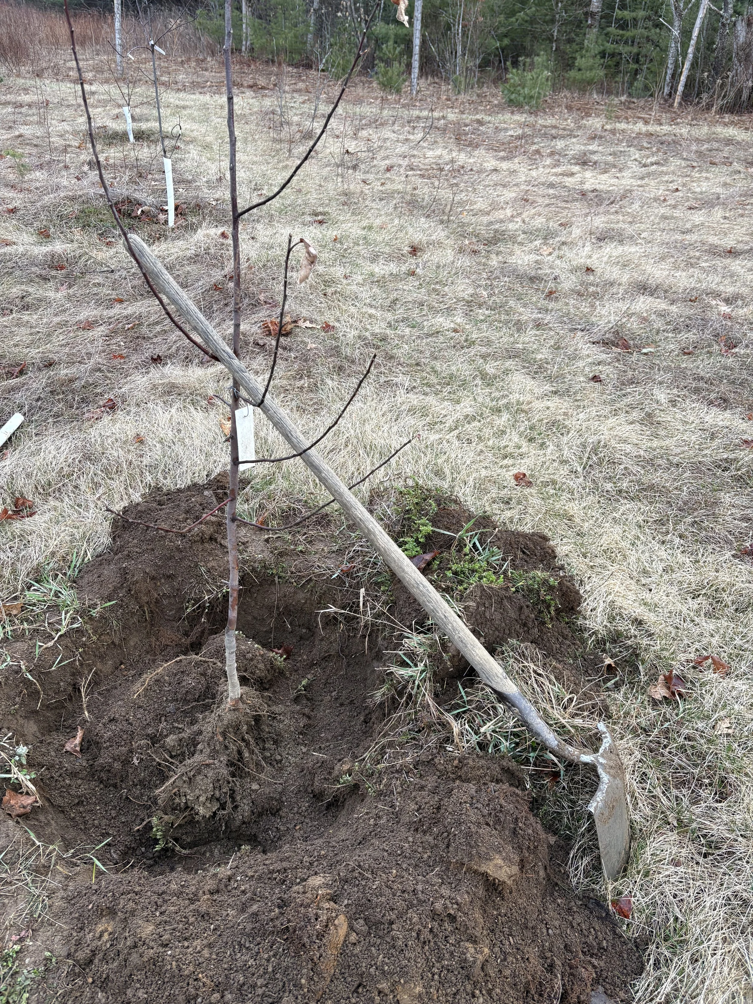 Planted the first tree of the season today. It felt wonderful to put the foot to the shovel and the shovel to the earth. There was no frost left, and the tree came out of the nursery with ease. I walked it down to the end of row 2 up at Finley, big clump of dirt still on the roots, and it was nestled into its new home five minutes later. The cultivar was Beagle Bitter, a yellow, 2” bittersweet from New York state, introduced by Jason Mannka and Mike Biltonen. It will become part of our ongoing trial of apples with potential for cider and cooking.