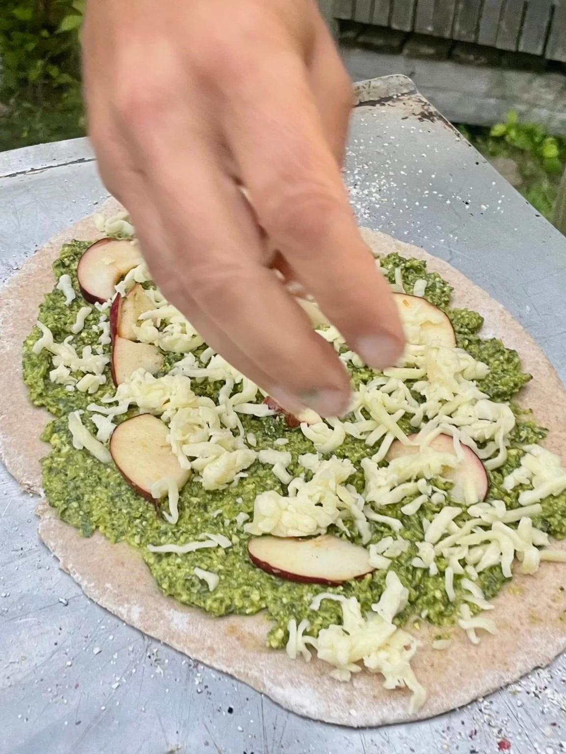 A pizza in the making, topped with pesto, mozzarella, and Black Oxford apple slices, July 4, 2025.