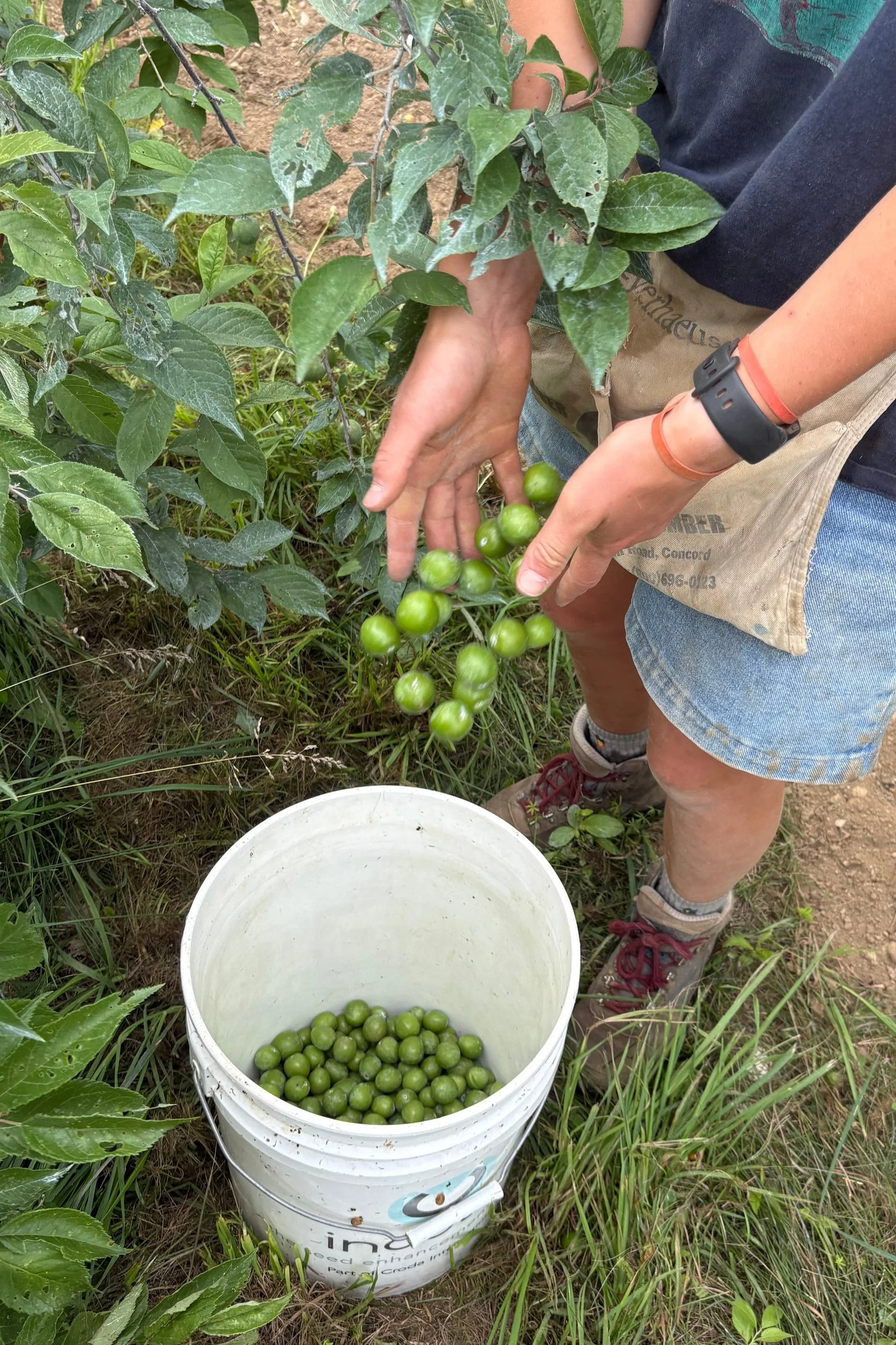 We also began to thin the plums. The plum crop (knock on wood) could be one of the best in recent years. There are gazillions on the trees, so many that the branches are already in danger of breaking. We put on cloth nail aprons from the lumber yard and then pinch-off any of the small green plums that are touching one another. When the plums are allowed to touch one another, they often gets brown rot which ruins them. Less fruit also puts less strain on the tree branches. The little plums will eventually go into the compost. On some branches, we removed nearly 3/4 of the fruit. It seems extreme, but even after thinning, the trees are loaded. We’ll thin all the plum trees over the next couple days and then hit the apples. It’s thinning time.