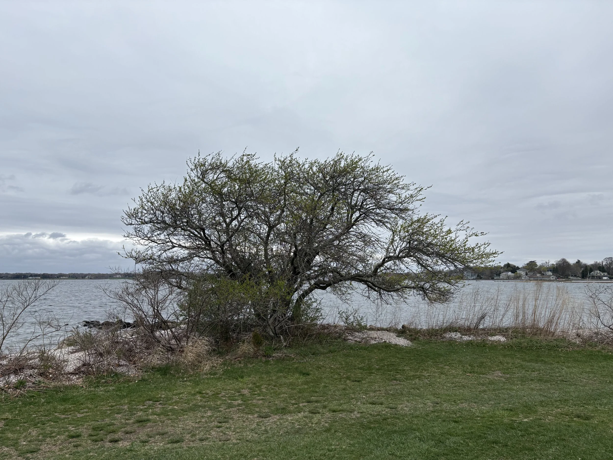 Unfortunately we did not plant any trees today. We did plant 34 on Sunday, but we’re out of town today so—I guess—we get a pass. We’ll plant more this coming weekend. But we did spend a bunch of time with trees yesterday and today. Yesterday we were at the amazing Mount Auburn Cemetery in Cambridge, MA. It’s an incredible place to go see trees. Today we celebrated in Rhode Island with friends who took us to Blithewold Arboretum along the shore of Narragansett Bay. At Blithewold walking along the shore, what did we encounter? An apple tree of course. Who insists that apple trees need well-drained soil and a gentle slope and a special pH? The apple tree we visited was growing about two feet from the high-tide line in a pile of salt and shells and seaweed. And it looked very happy to be there.