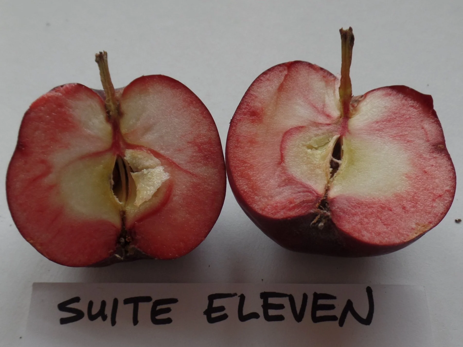 Suite Eleven: I first saw the beautiful, dark purple-black fruit at the 2014 Great Maine Apple Day. When I visited the tall, skinny tree growing between buildings in the back streets of Portland, ME, I parked illegally nearby in the parking spot for “Suite 11.” Hence the name. A sweet eleven years later we’re finally planting a tree of our own.