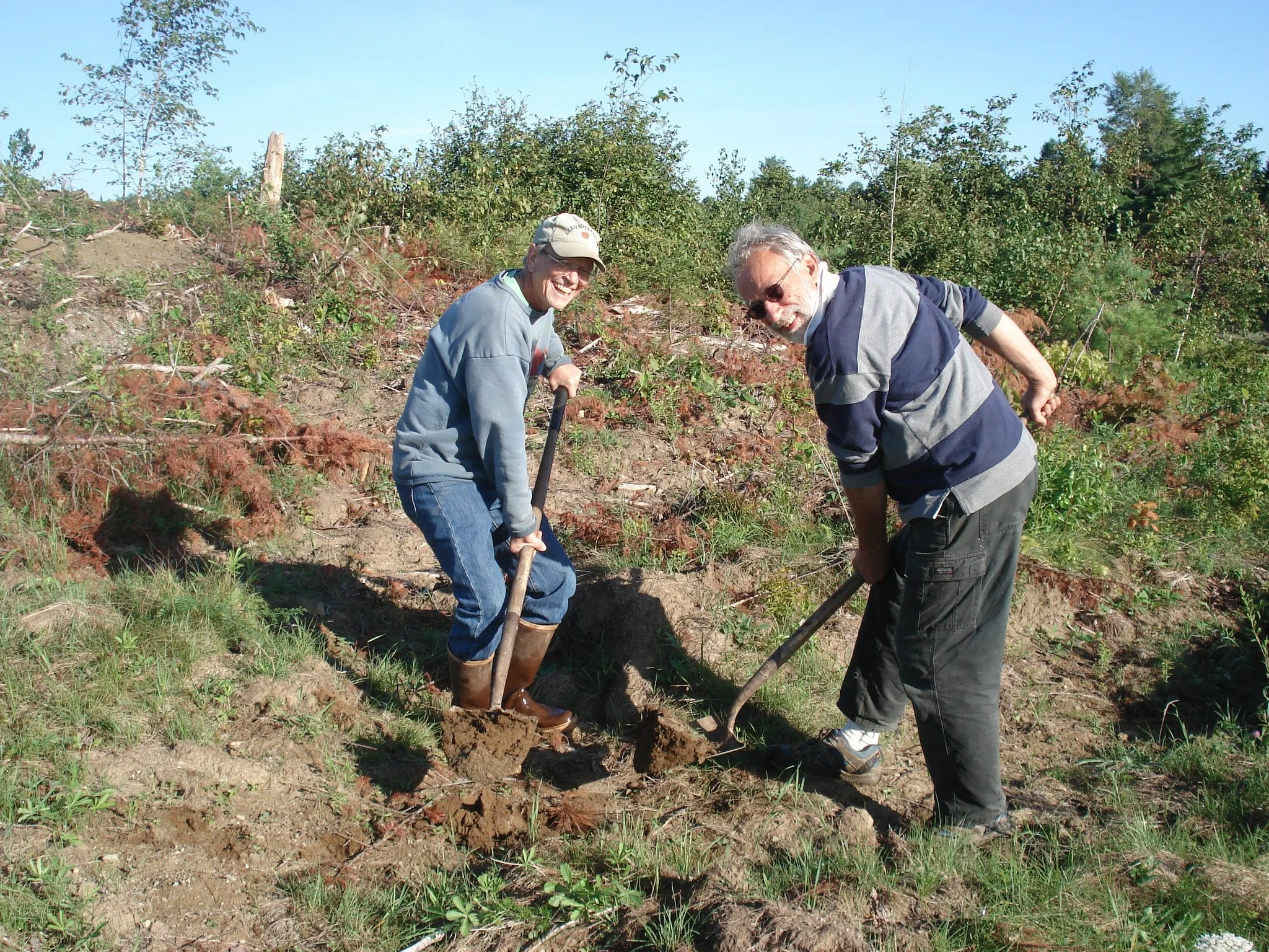 John and Vernon LeCount with the first two shovelfuls at the site of the Maine Heritage Orchard, August 6, 2013