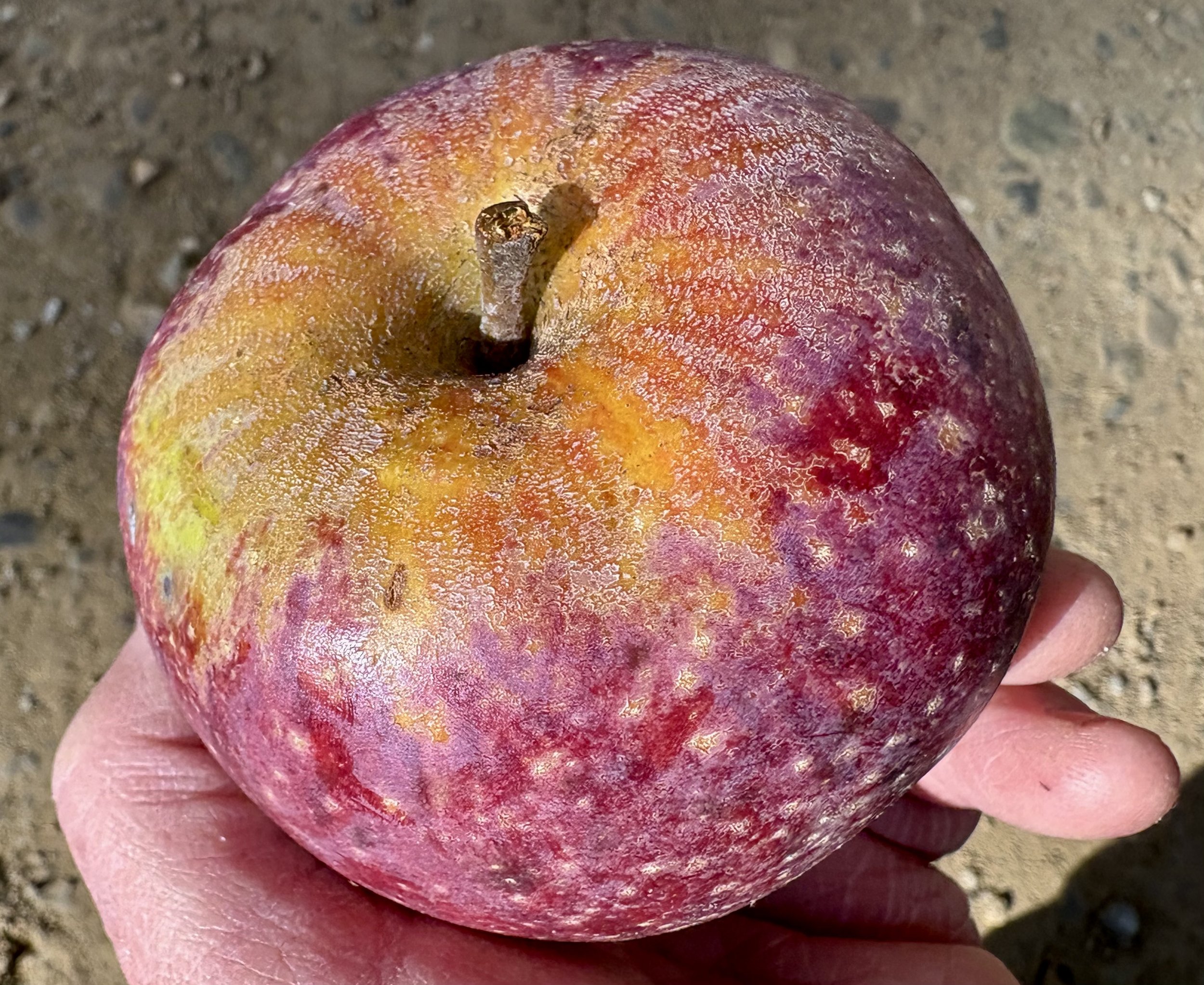 We found Larry who took us to the tree from which those first two apples came. It was not in good shape, but it did have a few reasonably decent-looking fruit. We took fruit and leaves. The fruit is definitely not Salome. That’s a good thing. We’ll do a complete detailed description and see if it matches any other apples we know. I’ll also compare the fruit to the photo I still have of Larry’s fruit. We’ll submit leaves for a DNA profile. Then we’ll keep our fingers crossed (an old scientist’s trick).