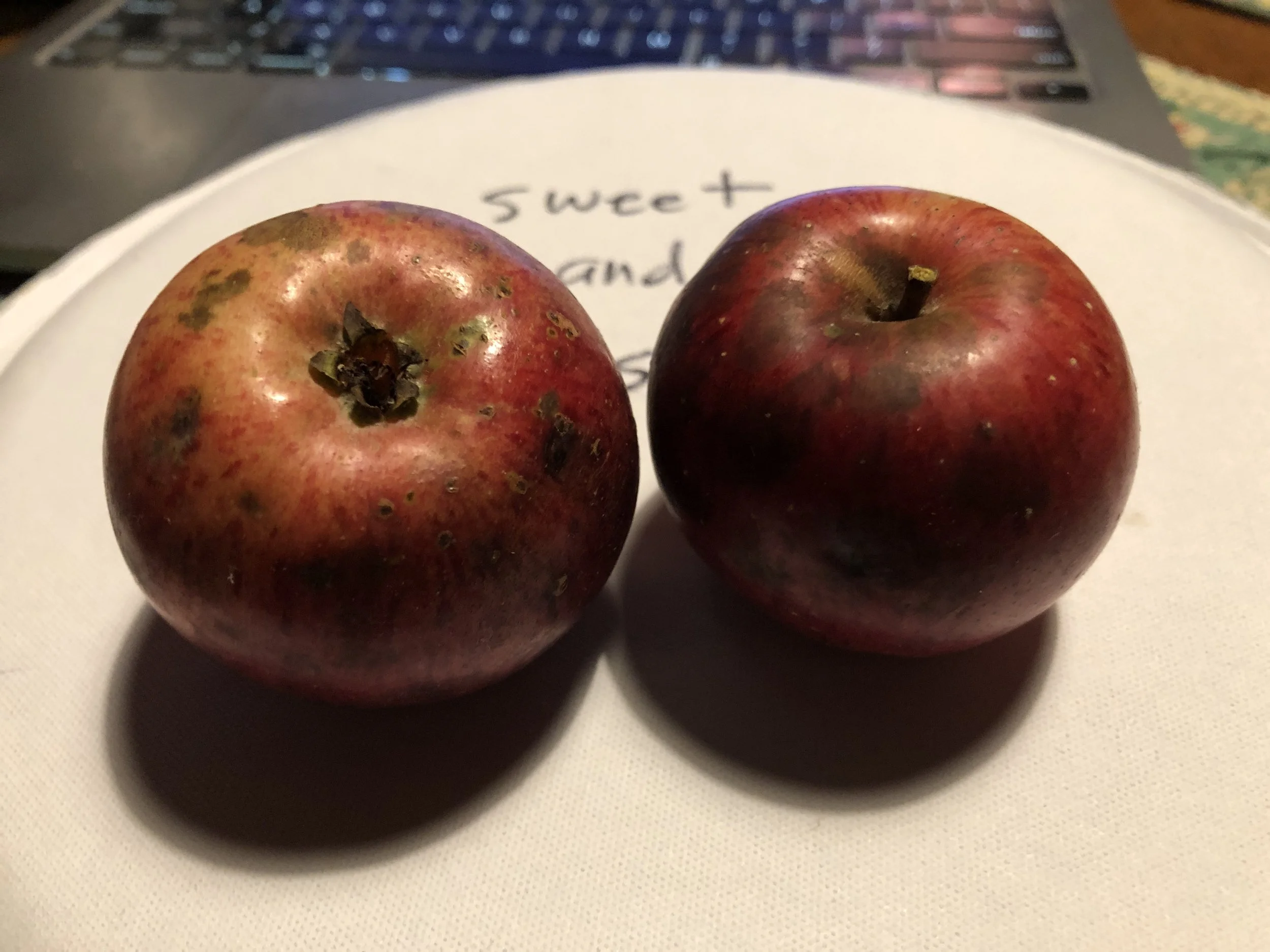 Pressure Drop is a small, round, dull-red, bittersweet cider fruit that resembles Fameuse and Dabinett in coloring and general appearance. It ripens late and was still hanging on the tree in January, 2024. The spongy fruit tastes like a true cider apple. Cammy described her first bite as “sweet and rosy.” We discovered the multi-stemmed roadside seedling by an abandoned mobile home on the road from Orland to Castine, ME in 2023. We now have it on trial at SCF, and we’re excited about its cider potential. Scionwood from the original tree.